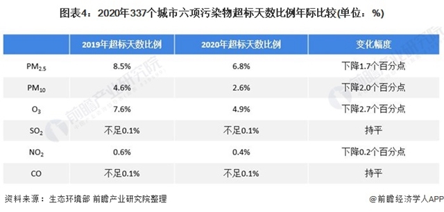 2020年,中國(guó)337個(gè)城市PM2.5、PM10、O3、SO2、NO2和CO濃度分別為33微克/立方米、56微克/立方米、138微克/立方米、10微克/立方米、24微克/立方米和1.3毫克/立方米。與2019年相比,六項(xiàng)污染物濃度均下降。