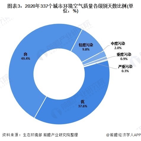 2020年,全國(guó)337個(gè)城市平均優(yōu)良天數(shù)比例為87.0%,比2019年上升5.0個(gè)百分點(diǎn)。其中,17個(gè)城市優(yōu)良天數(shù)比例為100%、243個(gè)城市優(yōu)良天數(shù)比例在80%-100%之間、74個(gè)城市優(yōu)良天數(shù)比例在50%-80%之間、3個(gè)城市優(yōu)良天數(shù)比例低于50%;平均超標(biāo)天數(shù)比例為13.0%,以PM2.5、O3、PM10、NO2和SO2位首要污染物的超標(biāo)天數(shù)分別占總超標(biāo)天數(shù)的51.0%、37.1%、11.7%、0.5%和不足0.1%,未出現(xiàn)以CO為首要污染物的超標(biāo)天。