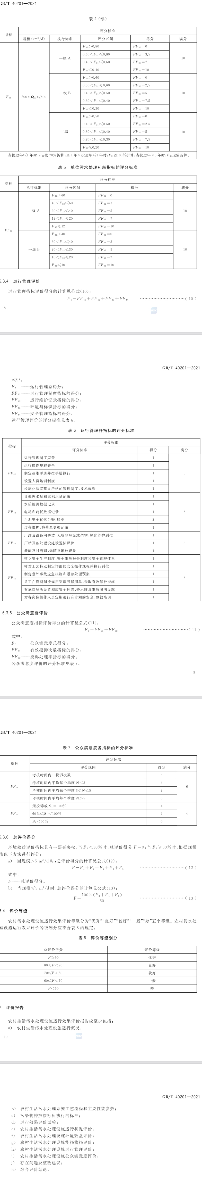 1、范圍本標(biāo)準(zhǔn)規(guī)定了農(nóng)村生活污水處理設(shè)施運(yùn)行效果評(píng)價(jià)的總則、評(píng)價(jià)指標(biāo)與計(jì)算方法、評(píng)價(jià)方法,以及評(píng)價(jià)報(bào)告。本標(biāo)準(zhǔn)適用于農(nóng)村生活污水處理設(shè)施(規(guī)模≤500m3/d)運(yùn)行效果評(píng)價(jià)。