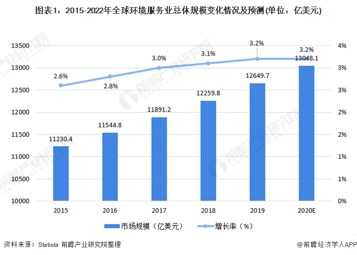 隨著環(huán)境保護和可持續(xù)發(fā)展理念的廣泛普及,世界環(huán)境服務(wù)業(yè)市場呈現(xiàn)迅速發(fā)展的勢頭,世界各國,特別是發(fā)達國家紛紛出臺相關(guān)政策并加大資金投入,加大對環(huán)保市場的扶持力度。2019年全球環(huán)境服務(wù)業(yè)市場規(guī)模達到12649.70億美元,同比增長3.20%,預(yù)估全球環(huán)境服務(wù)市場繼續(xù)保持穩(wěn)步發(fā)展態(tài)勢,2020年全球總規(guī)模達到13048.1億美元。