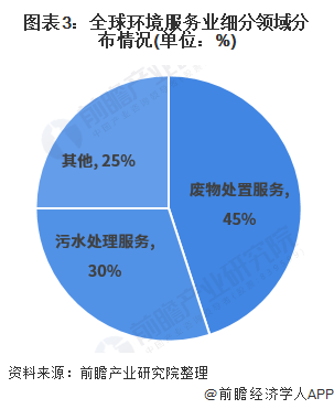 環(huán)境服務(wù)業(yè)各分項目發(fā)展很不平衡,廢物處置服務(wù)和污水處理服務(wù)占環(huán)境服務(wù)市場的主要份額。目前,這兩個項目產(chǎn)值占全球環(huán)境服務(wù)市場的75%,其中廢物處置服務(wù)占45%,污水處理服務(wù)占30%。