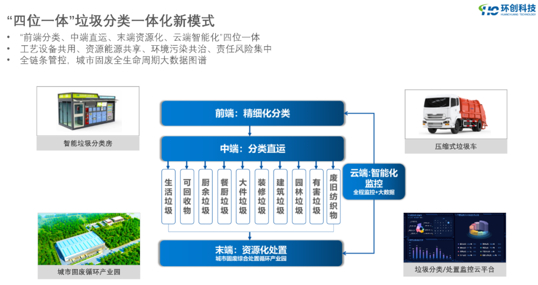 不同于傳統(tǒng)的垃圾分類或環(huán)衛(wèi)運(yùn)營(yíng)項(xiàng)目,“四位一體”垃圾分類一體化新模式,包括“前端精細(xì)化分類、中端分類直運(yùn)、末端資源化處置、云端智能化監(jiān)控”“四位一體”,是覆蓋垃圾的產(chǎn)生、運(yùn)輸、資源化處置及數(shù)據(jù)云端的全鏈條一體化處置模式。