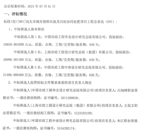 近日,包頭市公共資源交易網(wǎng)發(fā)布了包頭市城市餐廚垃圾及污泥協(xié)同處置項(xiàng)目工程總承包(EPC)中標(biāo)候選人公示,公示顯示該項(xiàng)目第一中標(biāo)候選人為中國(guó)市政工程華北設(shè)計(jì)研究總院有限公司,投標(biāo)報(bào)價(jià)為298508645元。
