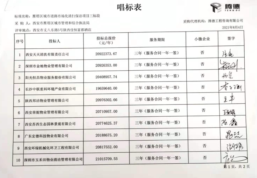 附:西安市雁塔區(qū)城市道路市場化清掃保潔項目開標情況