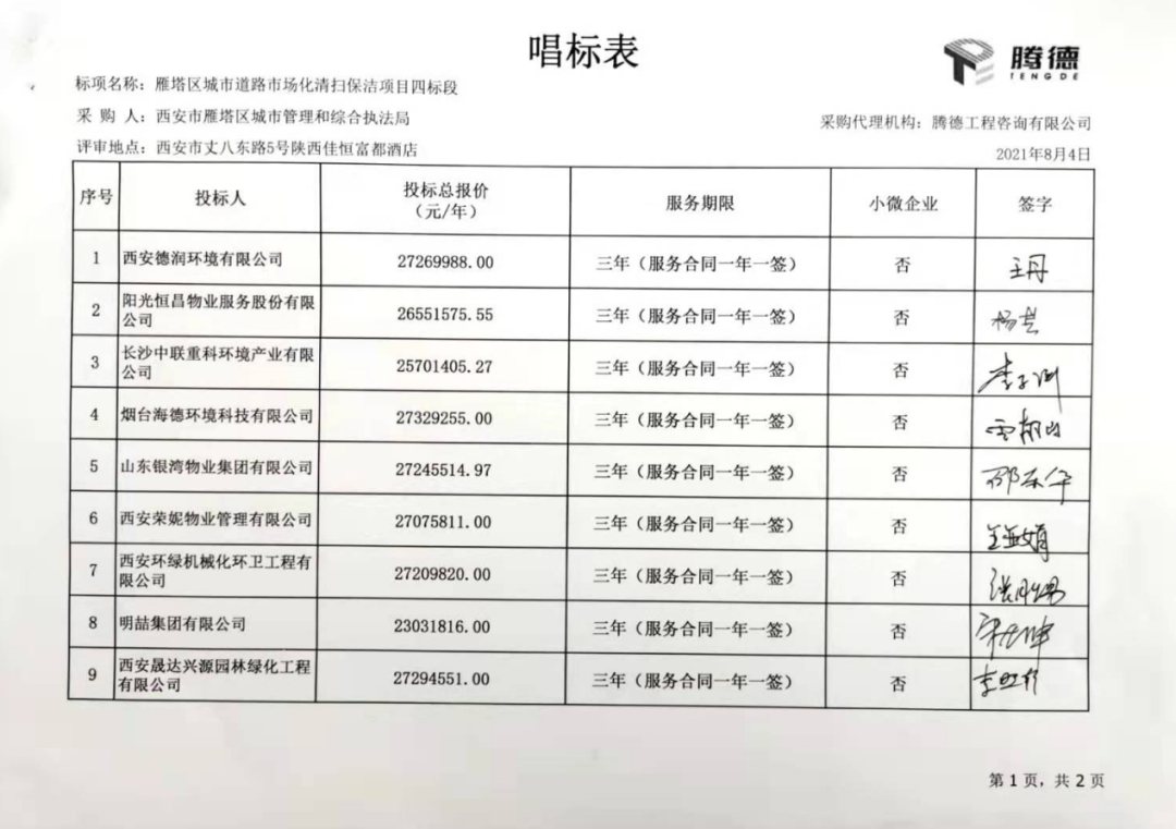 二標段共有5家投標企業(yè)參與報價,西安易之順物業(yè)管理有限公司勝出,成交價19,092,720元/年,服務期3年。