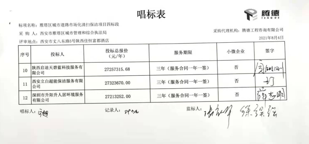 四標段共有12家投標企業(yè)參與報價,西安德潤環(huán)境有限公司勝出,成交價27,269,988元/年,服務期3年。