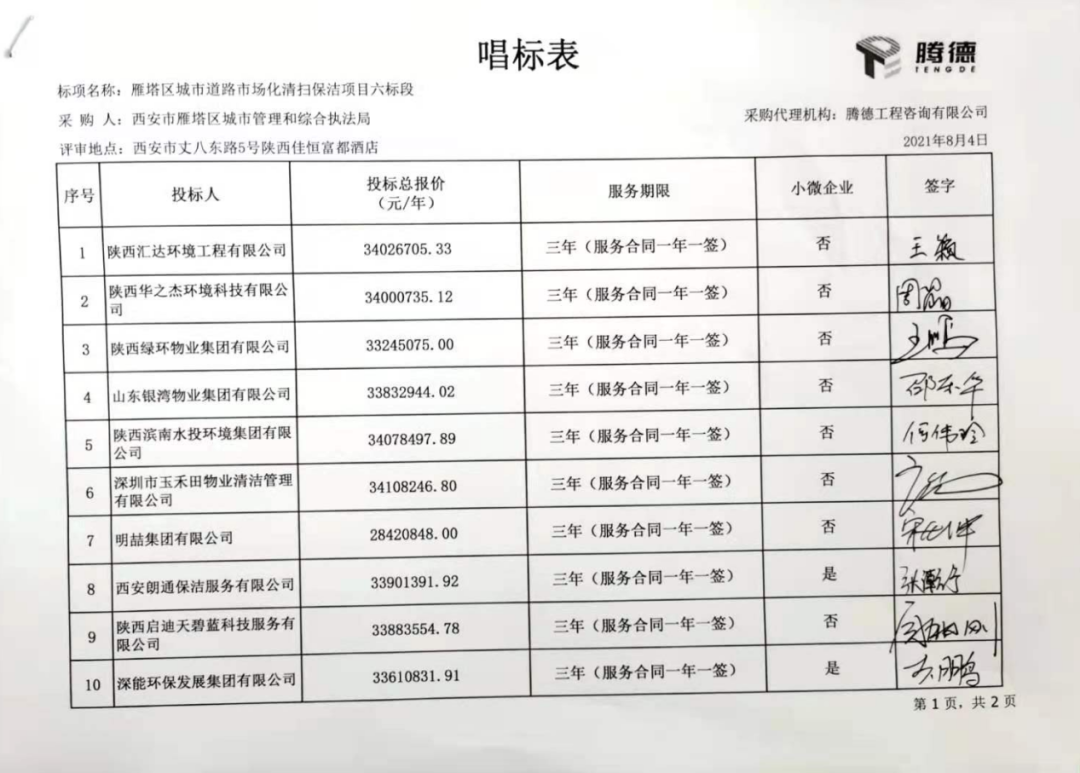 六標段共有13家投標企業(yè)參與報價,陜西華之杰環(huán)境科技有限公司勝出,成交價34,000,735元/年,服務期3年。