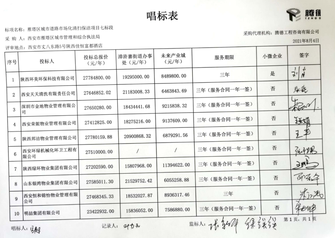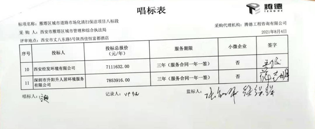 七標段共有10家投標企業(yè)參與報價,西安天天清洗有限責任公司勝出,成交價27,646,852元/年,服務期3年。