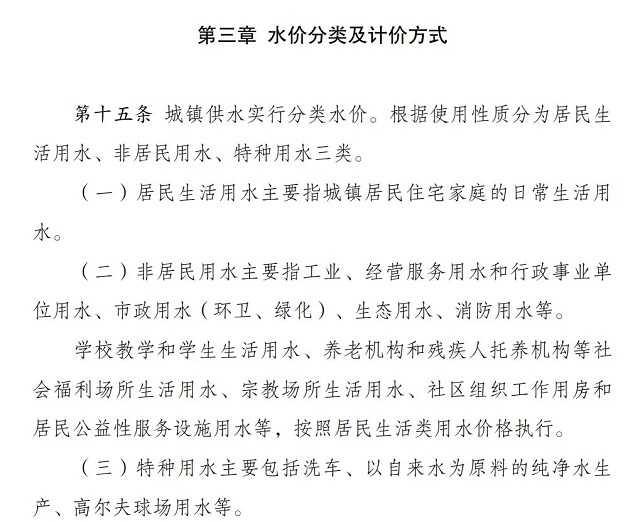 這方面,城鎮(zhèn)供水根據(jù)使用性質(zhì)分為居民生活用水、非居民用水、特種用水三類,居民生活用水實行階梯水價制度、非居民用水實行超定額累進加價制度。