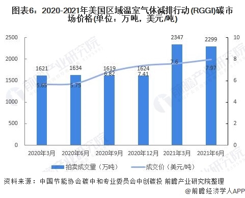 2020-2021年,美國(guó)RGGI碳市場(chǎng)價(jià)格呈上升趨勢(shì)。RGGI碳市場(chǎng)的初始配額發(fā)放以拍賣為主,每個(gè)季度舉行一次拍賣。2021年第一季度拍賣成交均價(jià)為$7.60美元,較上一季度漲幅為2.5%。由于弗吉尼亞州的加入,RGGI總成交量創(chuàng)歷史新高,達(dá)到了2347萬噸。2021年第二季度,美國(guó)RGGI拍賣成交均價(jià)為7.97美元,較上一季度漲幅為4.9%,總成交量為2299萬噸。