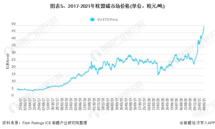 2019-2020年,由于歐盟排放交易體系規(guī)則的收緊預(yù)期以及碳免費(fèi)配額的減少,ETS碳價(jià)格從平均每噸25歐元翻倍至2021年5月初的每噸50歐元左右。