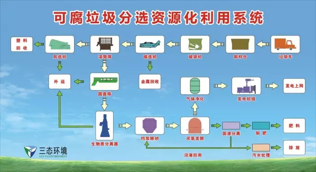 以浙江三門縣鄉(xiāng)鎮(zhèn)垃圾處理項目為案例,該項目技術(shù)最大特點為具有優(yōu)良的分選技術(shù)——二次分類自動化??梢栽诖迕癯醴值幕A上,經(jīng)機械自動精細分選,可選出90%以上的可腐爛垃圾,彌補現(xiàn)階段人工分類的不足。前端分選分類工程是三態(tài)的研究重點之一,其開發(fā)了小型前端智能分類、大型后端機械分類。厭氧發(fā)酵工藝也是三態(tài)體系中的重點技術(shù),目前吉林項目已運行三年多,是國內(nèi)較為大型的混合垃圾厭氧發(fā)酵穩(wěn)定運行的唯一一家。