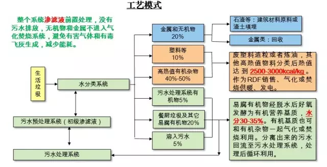 以自有研發(fā)的垃圾水分類技術(shù)為核心和前提,結(jié)合并優(yōu)化現(xiàn)有垃圾分類方法、資源再生技術(shù)的垃圾處理方法,整個系統(tǒng)滲濾液前置處理,沒有污水排放,無機物和金屬不進入氣化焚燒系統(tǒng),避免有害氣體和有毒飛灰生成,減少能耗。以其恩施項目為典型案例,對其具有自主專利的垃圾水分類技術(shù)進行了全面的介紹,具有綜合利用率80%以上,無二次污染,清洗水全部經(jīng)處理回用,氣化燃氣和煙氣排放達標無隱患等技術(shù)特點。