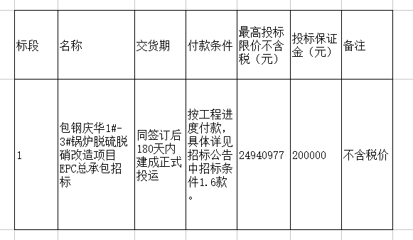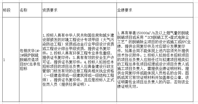 包鋼慶華1#-3#鍋爐脫硫脫硝改造項目EPC總承包(再次)招標,內(nèi)容如下,明細詳見公告附表