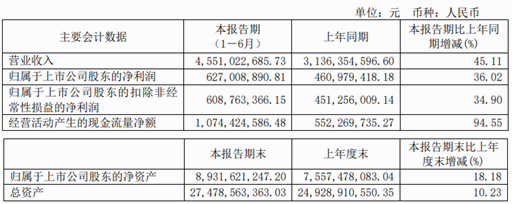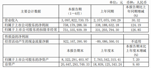截至報告期內(nèi),公司經(jīng)營狀況持續(xù)走高,實現(xiàn)營業(yè)收入21.62億元,較上年增長199.93%;實現(xiàn)歸母凈利潤51.03億元,較上年增長7.7%。