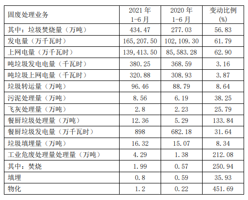 固廢業(yè)務主營業(yè)務收入增長的主要原因是報告期內(nèi)新增生活垃圾焚燒發(fā)電項目處理規(guī)模共 5700 噸/日、部分有機廢棄物處理項目及南海工業(yè)危廢處理項目投產(chǎn),環(huán)衛(wèi)業(yè)務、工程收入增加等,同時因加大業(yè)務拓展力度及信息化、智能化應用不斷加強,協(xié)同效應和產(chǎn)能利用率進一步提升,且去年上半年因疫情影響基數(shù)較低。