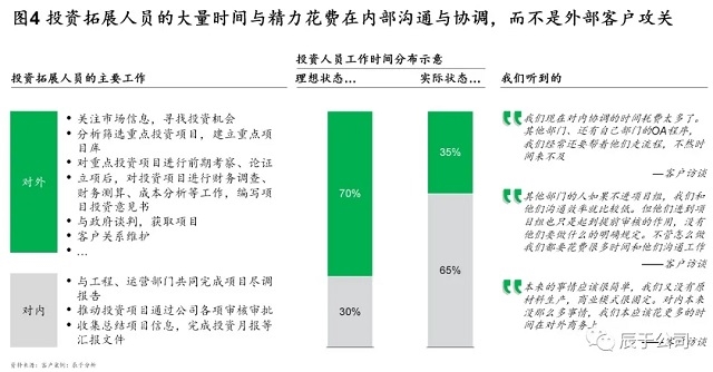 理想狀態(tài)下,對外對內(nèi)工作的時間分配比例應(yīng)該是7:3,甚至更高也不為過,但現(xiàn)實(shí)往往相反,由于內(nèi)部協(xié)同效率不高、流程繁冗、“人治”問題嚴(yán)重,我們發(fā)現(xiàn)一些投資拓展人員更多的時間與精力花費(fèi)在內(nèi)部溝通與協(xié)調(diào),而不是外部客戶攻關(guān)。造成這種現(xiàn)象的原因,表面看上去是內(nèi)部流程繁瑣,決策鏈條冗長,實(shí)則是內(nèi)部沒有形成一以貫之以市場為導(dǎo)向、以項(xiàng)目為核心的理念文化。平時大多只是喊喊口號而已,并未真正付諸行動。