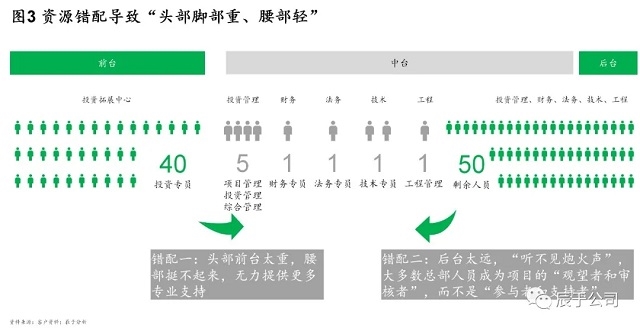 不難發(fā)現(xiàn),近年來一些企業(yè)開始“招兵買馬”,大量招聘投資拓展人員,這對于企業(yè)提高投資拓展能力自然是好事。不過我們也注意到,一些企業(yè)在投資相關(guān)的人員配置上卻不盡合理:他們通常把大量投資拓展人員“撒在前線”,同時建立“大后臺”,與投資相關(guān)的投管、財(cái)務(wù)、法務(wù),甚至技術(shù)、工程、運(yùn)營等人員主要負(fù)責(zé)項(xiàng)目質(zhì)量把關(guān)和風(fēng)險管控,只有少量人員在中臺為前臺提供支持。這種“頭重腳重”帶來兩個“錯配”,一是頭部前臺太重,腰部挺不起來,無力提供更多專業(yè)支持;二是腳部后臺太遠(yuǎn),“聽不見炮火聲”,大多數(shù)人成為項(xiàng)目的“觀望者和審核者”,而不是“參與者和支持者”。