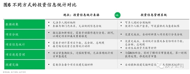 造成這一現(xiàn)象的原因,一是如前文所述,企業(yè)自身很多投資拓展條線的問題尚未厘清,上系統(tǒng)往往是無用功,解決不了實(shí)際問題;二是提供這類服務(wù)的專業(yè)公司很少,往往需要企業(yè)在通用軟件的基礎(chǔ)上進(jìn)行二次開發(fā),成本較高且難度較大,導(dǎo)致很多企業(yè)望而卻步。