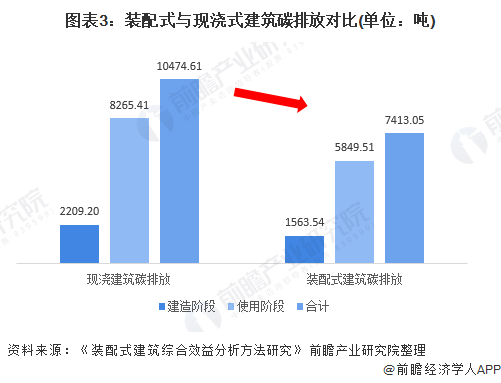 裝配式建筑是由預制部品部件在工地裝配而成的建筑。與現(xiàn)澆式建筑相比,裝配式建筑施工方式在建材生產(chǎn)及施工階段碳排放量均有一定程度的節(jié)約,一方面,裝配式建筑采用集約規(guī)模型數(shù)字化生產(chǎn)模式,在一定程度上減少了材料消耗;另一方面,其后期采用機械化安裝方式,大幅度規(guī)避了建筑廢棄物出現(xiàn),能耗減少超20%,節(jié)能減排優(yōu)勢明顯。