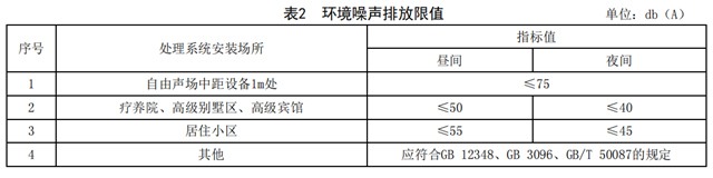 7.5 應(yīng)采取隔聲、吸聲、降噪等措施。處理系統(tǒng)產(chǎn)生的環(huán)境噪聲應(yīng)符合GB 12348、GB 3096、GB/T 50087的規(guī)定。具體指標(biāo)見表2。