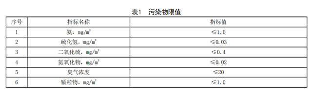 7.4 氨、硫化氫、二氧化硫、氮氧化物和臭氣濃度等惡臭污染物廠界排放限值應(yīng)符合GB 14554中惡臭污染物廠界標(biāo)準(zhǔn)相應(yīng)級(jí)別的指標(biāo)值。顆粒物應(yīng)符合GB 3095-2012表1中二級(jí)濃度限值要求。具體要求見表1。