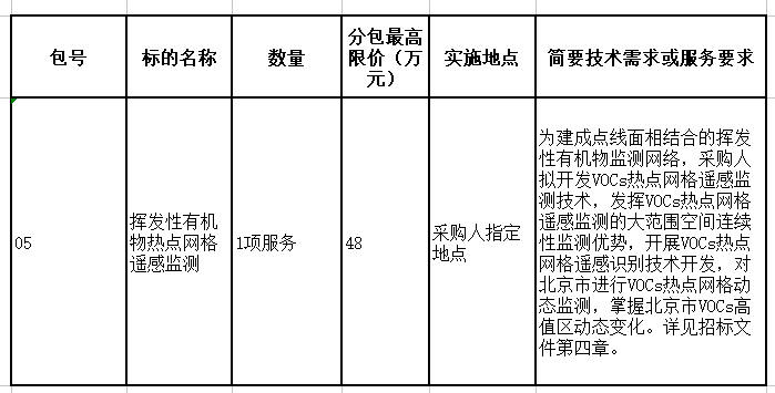北京市揮發(fā)性有機(jī)物解析能力建設(shè)一期(中央資金)-揮發(fā)性有機(jī)物熱點(diǎn)網(wǎng)格遙感監(jiān)測公開招標(biāo)公告