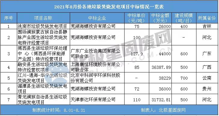 8月垃圾焚燒發(fā)電項(xiàng)目中標(biāo)匯總?cè)缦拢?/span>