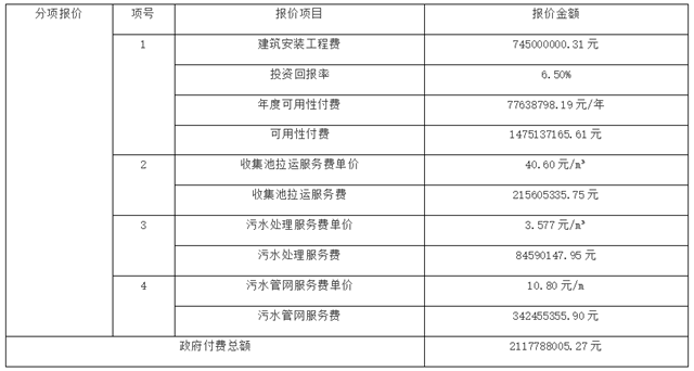 雙方合作期限20年,建設(shè)期1年、運營期19年。采用建設(shè)-運營-移交(BOT)的操作模式,于合作期滿后,由項目公司將項目資產(chǎn)無償移交給政府或其他政府指定機構(gòu)。預中標項目投資90404萬元,政府付費2117788005.27元。