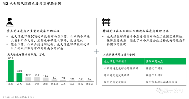 在危廢產(chǎn)量高的省份,頭部企業(yè)更是具有絕對優(yōu)勢,例如光大綠色環(huán)保,一方面重點關(guān)注危廢產(chǎn)生量高度集中的區(qū)域,早早布局江蘇、山東兩個產(chǎn)廢大省和貯存大省,將其60%的產(chǎn)能都布局于此,兩省累計布局超過110萬噸的產(chǎn)能,以此為基礎(chǔ),在江蘇、山東產(chǎn)能逐漸過剩時,其最新的項目開始以江蘇為中心向東南各省擴展;另一方面,他們也特別關(guān)注危廢產(chǎn)量高省份在工業(yè)園區(qū)及周邊布局危廢處理設(shè)施,擁有多個危廢項目布局在工業(yè)園區(qū)及周邊,保障危廢來源,避免了中小產(chǎn)廢企業(yè)遷移或關(guān)停造成拿料困難的情況(見圖2)。