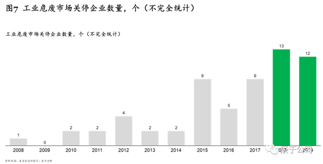 一是與市場需求種類不匹配,根據(jù)2019年最新修訂發(fā)布的《國家危險廢物名錄》,我國危險廢物分類共有46大類,471種,而我國90%以上危廢處置企業(yè)僅能處置5種或以下的危廢種類,供需種類錯配的現(xiàn)象較嚴重;二是產(chǎn)能落后,處置規(guī)模小,技術(shù)和使用設(shè)備落后,無法滿足污染防治的要求;三是安全隱患突出,環(huán)境管理水平低下以及相關(guān)危險廢物經(jīng)營安全的規(guī)章制度不完善,導致環(huán)境安全隱患問題突出??梢灶A見的是,隨著市場競爭日益激烈,“小而弱”的工業(yè)危廢企業(yè)將越來越難以適應市場新要求,頻頻被“出清”。據(jù)不完全統(tǒng)計,2010-2014年,每年關(guān)停的工業(yè)危廢服務(wù)企業(yè)僅為2——4家,2018和2019年則分別達到了13和12家(見圖7)。