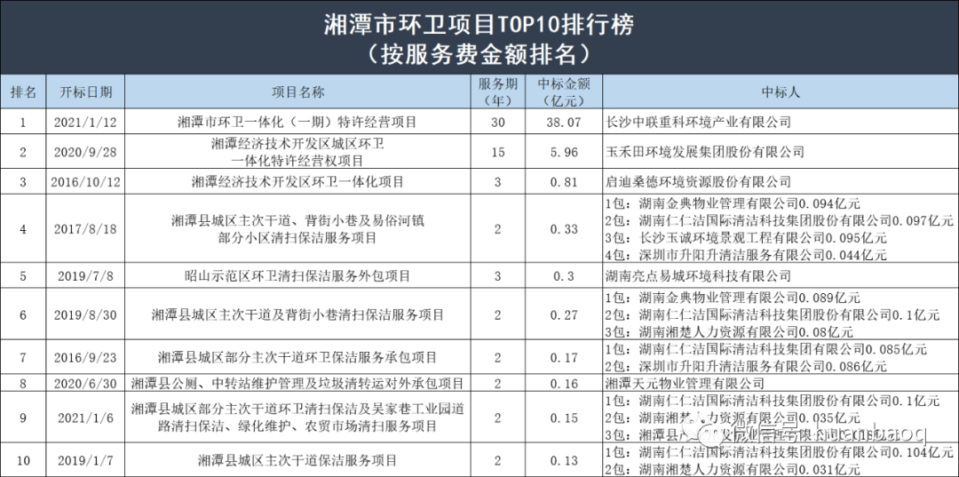 不過(guò),換個(gè)角度,如果從中標(biāo)金額看,盈峰中聯(lián)則是最大的勝利者,雖然只中標(biāo)一個(gè)項(xiàng)目,但是服務(wù)費(fèi)高達(dá)38.07億元,位列第一;第二和第三分別為玉禾田和啟迪桑德環(huán)境,中標(biāo)金額分別為59601.9萬(wàn)元和8080.86萬(wàn)元,其實(shí)這兩家公司也僅僅中標(biāo)了一個(gè)項(xiàng)目。? 首先值得注意的是本地“巨鱷”——長(zhǎng)沙中聯(lián)重科環(huán)境產(chǎn)業(yè)有限公司。剛剛過(guò)去的8月21日,盈峰中聯(lián)發(fā)布了2021年半年度報(bào)告,營(yíng)收54.48億元,歸母凈利潤(rùn)3.71億元。報(bào)告期內(nèi),公司環(huán)衛(wèi)服務(wù)營(yíng)業(yè)收入實(shí)現(xiàn)13.53億元,同比增長(zhǎng)68.64%,成功突破廣州、蘇州、武漢、中山、三亞等15個(gè)地級(jí)市首次落地環(huán)衛(wèi)服務(wù)項(xiàng)目,市場(chǎng)開(kāi)拓能力顯著。在湖南本地環(huán)衛(wèi)市場(chǎng)上,該公司今年也斬獲了多個(gè)億級(jí)項(xiàng)目:·2021年1月12日,中標(biāo)湘潭市環(huán)衛(wèi)一體化(一期)特許經(jīng)營(yíng)項(xiàng)目,項(xiàng)目特許經(jīng)營(yíng)期限30年,總服務(wù)費(fèi)約為38.07億元;·2021年5月31日,中標(biāo)邵陽(yáng)市新寧縣城鄉(xiāng)環(huán)衛(wèi)一體化項(xiàng)目特許經(jīng)營(yíng)項(xiàng)目,合計(jì)投標(biāo)總價(jià)4.81億元,服務(wù)期15年(含建設(shè)期1年);·2021年7月19日,中標(biāo)湘西土家族苗族自治州鳳凰縣城鄉(xiāng)生活垃圾收轉(zhuǎn)運(yùn)一體化服務(wù)采購(gòu)項(xiàng)目,服務(wù)期限8年,總服務(wù)金額約為2.14億;中標(biāo)價(jià)231元/噸,項(xiàng)目日轉(zhuǎn)運(yùn)規(guī)模317.62噸(保底量設(shè)定為300噸/天,超出部分據(jù)實(shí)結(jié)算)。鑒于盈峰中聯(lián)在行業(yè)內(nèi)的強(qiáng)悍實(shí)力和湖南本土企業(yè)的地區(qū)優(yōu)勢(shì),筆者預(yù)測(cè)未來(lái)很長(zhǎng)時(shí)間內(nèi),他將持續(xù)稱(chēng)霸湘潭市環(huán)衛(wèi)市場(chǎng)。根據(jù)2021年上半年年報(bào),玉禾田營(yíng)業(yè)收入約23.98億元,同比增長(zhǎng)16.61%。此項(xiàng)數(shù)據(jù)已經(jīng)超過(guò)了該企業(yè)去年全年?duì)I收的一半。在湖南省環(huán)衛(wèi)市場(chǎng)上,玉禾田也有一定的收獲,中標(biāo)的湘潭市項(xiàng)目是該地區(qū)唯二的億級(jí)環(huán)衛(wèi)項(xiàng)目:·2020年9月28日,中標(biāo)湘潭經(jīng)濟(jì)技術(shù)開(kāi)發(fā)區(qū)城區(qū)環(huán)衛(wèi)一體化特許經(jīng)營(yíng)權(quán)項(xiàng)目,服務(wù)期15年,服務(wù)費(fèi)5.96億元。·2021年4月21日,中標(biāo)株洲市蘆淞區(qū)環(huán)衛(wèi)服務(wù)項(xiàng)目,中標(biāo)金額為1.35億元,服務(wù)期3年。本項(xiàng)目分為9個(gè)包組,玉禾田中標(biāo)包2,服務(wù)費(fèi)3217.33萬(wàn)元。作為一個(gè)外地企業(yè),玉禾田已經(jīng)在湖南省內(nèi)成功打開(kāi)了局面,期待他有更好的表現(xiàn)。? 排名第三的是啟迪桑德環(huán)境資源股份有限公司。對(duì)湘潭市環(huán)衛(wèi)市場(chǎng)而言,啟迪環(huán)境入局時(shí)間很早。2016年10月12日,啟迪桑德環(huán)境中標(biāo)湘潭經(jīng)濟(jì)技術(shù)開(kāi)發(fā)區(qū)環(huán)衛(wèi)一體化項(xiàng)目,但此后,就再也未能見(jiàn)到該企業(yè)中標(biāo)湘潭市環(huán)衛(wèi)項(xiàng)目的信息。近年來(lái),啟迪環(huán)境常被負(fù)面信息纏身。根據(jù)啟迪環(huán)境2021年上半年業(yè)績(jī)預(yù)告,預(yù)計(jì)2021年上半年虧損33億元至40億元,相較于上年同期的盈利1.81億元,同比大降1927%—2315%。對(duì)啟迪環(huán)境來(lái)說(shuō),解決財(cái)務(wù)問(wèn)題的最大的轉(zhuǎn)機(jī)或許是1月11日城發(fā)環(huán)境發(fā)布的擬換股吸收合并事件。啟迪環(huán)境是否能通過(guò)和城發(fā)“聯(lián)姻”緩解資金鏈危機(jī)?此次行業(yè)矚目的合作是否能有“實(shí)錘”?我們將拭目以待。此外,榜單中的湖南仁仁潔國(guó)際清潔科技集團(tuán)有限公司、湖南晨曦清潔服務(wù)有限公司、湖南亮點(diǎn)易城環(huán)境科技有限公司均為湖南本地環(huán)衛(wèi)企業(yè)。湖南湘楚人力資源有限公司、湘潭天元物業(yè)管理有限公司都屬于非環(huán)衛(wèi)企業(yè),湖南永昌水上綜合服務(wù)有限公司則屬于水上運(yùn)輸服務(wù)業(yè)。另外一點(diǎn)值得注意的是,目前榜首的10家企業(yè)均為私企,顯示地方國(guó)企在湘潭市環(huán)衛(wèi)市場(chǎng)上明顯發(fā)力不足。