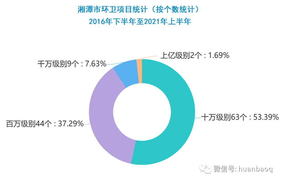 118個(gè)項(xiàng)目中,中標(biāo)金額最高的為2021年1月12日開(kāi)標(biāo)的湘潭市環(huán)衛(wèi)一體化(一期)特許經(jīng)營(yíng)項(xiàng)目,中標(biāo)金額38.07億元,中標(biāo)人為盈峰中聯(lián),服務(wù)期30年。排名第二的是2020年9月28日開(kāi)標(biāo)的湘潭經(jīng)濟(jì)技術(shù)開(kāi)發(fā)區(qū)城區(qū)環(huán)衛(wèi)一體化特許經(jīng)營(yíng)權(quán)項(xiàng)目,中標(biāo)人為玉禾田,中標(biāo)金額約為5.96億元,服務(wù)期15年。排行第三的則是2016年10月12日開(kāi)標(biāo)的湘潭經(jīng)濟(jì)技術(shù)開(kāi)發(fā)區(qū)環(huán)衛(wèi)一體化項(xiàng)目,中標(biāo)金額約為8080.86萬(wàn)元,中標(biāo)人為啟迪環(huán)境(中標(biāo)時(shí)公司名稱(chēng)為“啟迪桑德環(huán)境資源股份有限公司”),服務(wù)期3年。從中標(biāo)個(gè)數(shù)上看,118個(gè)項(xiàng)目中,十萬(wàn)級(jí)別的項(xiàng)目為63個(gè),占總數(shù)的一半以上;其次是百萬(wàn)級(jí)別的項(xiàng)目,共計(jì)44個(gè),約占總數(shù)的37%;千萬(wàn)級(jí)別項(xiàng)目較少,5年間僅為9個(gè);億級(jí)項(xiàng)目則更少,僅為2個(gè)(如下圖)。