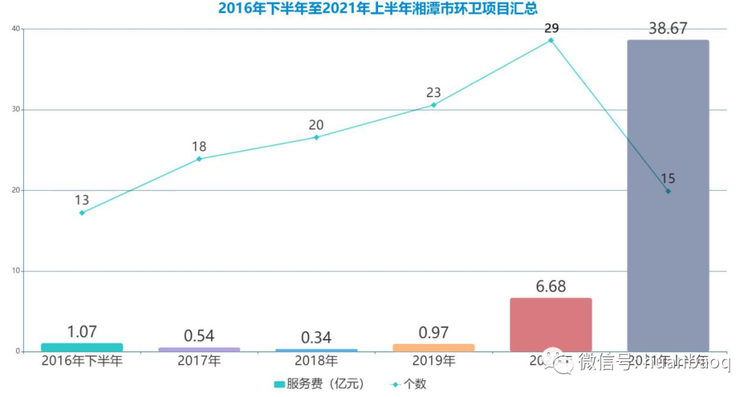 從以上幾個(gè)數(shù)據(jù)可以看出,湘潭環(huán)衛(wèi)市場(chǎng)也是“二八原則”明顯,最優(yōu)質(zhì)的大項(xiàng)目,數(shù)量雖然只有2個(gè),但是在金額上卻占據(jù)了5年總金額的91.08%。而這些大項(xiàng)目無(wú)一例外都是被名企盈峰中聯(lián)和玉禾田摘得。5年間,湘潭市中標(biāo)項(xiàng)目數(shù)量逐年遞增,2019年以前,大都還在每年20個(gè)以?xún)?nèi)。但2020年之后,項(xiàng)目數(shù)量和服務(wù)費(fèi)金額均有突飛猛進(jìn)的發(fā)展(如下圖)。