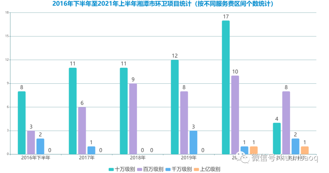 5年發(fā)布118個(gè)環(huán)衛(wèi)項(xiàng)目,2020年成轉(zhuǎn)折點(diǎn)據(jù)統(tǒng)計(jì),2016年7月1日至2021年6月30日,湘潭市共發(fā)布118個(gè)環(huán)衛(wèi)項(xiàng)目,服務(wù)費(fèi)金額合計(jì)約為48.34億元。▼118個(gè)環(huán)衛(wèi)項(xiàng)目中,TOP10項(xiàng)目的排行榜如下(按服務(wù)費(fèi)金額):