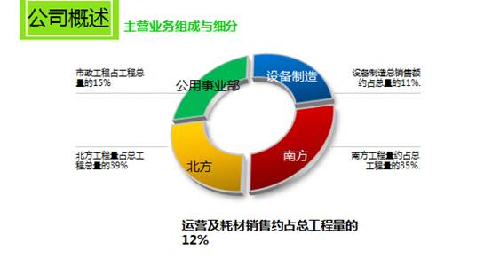 如上圖可見,紫科的主要業(yè)務(wù)細(xì)分為四大板塊,第一是設(shè)備制造,設(shè)備制造總銷售額約占總量的11%;第二是公用事業(yè)板塊,市政工程占工程總量的15%,在全國主要有兩個(gè)點(diǎn)。第一點(diǎn)在廣州總部,第二點(diǎn)在北京,這兩點(diǎn)一線負(fù)責(zé)全國市政的推廣;第三是北方板塊主要是工業(yè)板塊,總部在山東濰坊,是我們的全資子公司,北方工程量占總工程總量的39%;第四是南方板塊,總部在南京,南方工程量約占總工程量的35%。在運(yùn)營和耗材的銷售,從2015年開始已經(jīng)占到總銷售額的12%。