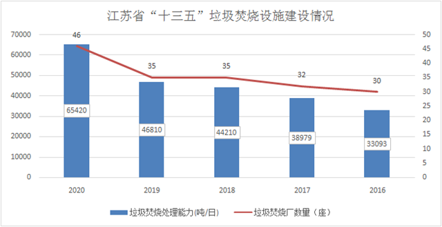 以江蘇省“十三五”垃圾焚燒建設(shè)為例,“十三五”時期,江蘇省城市生活垃圾處理設(shè)施較“十二五”新增15座,日處理能力翻了一倍,特別是2018年后,增幅明顯,這與《江蘇省環(huán)境基礎(chǔ)設(shè)施三年建設(shè)方案(2018——2020年)》印發(fā),組織實(shí)施一系列重點(diǎn)工程有關(guān)。按照《江蘇省“十四五”生態(tài)環(huán)境保護(hù)規(guī)劃》,“十四五”全省無害化能力僅計(jì)劃新增2萬噸/日,餐廚廢棄物處理能力計(jì)劃新增2000噸/日。