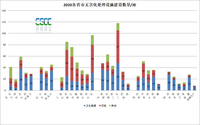 截至2020年,廣東、山東、江蘇、浙江四個省無害處理設(shè)施建設(shè)數(shù)量領(lǐng)跑,分別為118座、97座、85座和76座,它們建設(shè)的垃圾焚燒處理設(shè)施也最多,分別擁有57座、49座、46座、43座。而衛(wèi)生填埋場相對較多的省市則是廣東省(48座)、河北省(38座),河南省(36座),湖北省(34座)。按區(qū)域來看,華北地區(qū)、華中地區(qū)以及西南地區(qū)、東北地區(qū)建設(shè)垃圾填埋場數(shù)量明顯多于華東、華南地區(qū)。