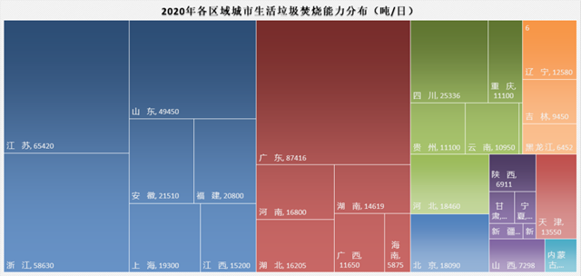 如果從無害化處理能力來看,又是另一番景象。廣東、山東、江蘇、浙江四省無害化處理能力仍然領(lǐng)跑,其中垃圾焚燒處理能力分別達(dá)到87416噸/日、49450噸/日、65420噸/日、58630噸/日??梢钥吹脚判蚵杂凶兓K、浙江的垃圾焚燒處理能力高于山東省,推算如果論平均單體垃圾焚燒項(xiàng)目規(guī)模,江蘇和浙江省高于山東省。數(shù)據(jù)中還可以看到,這幾個省份是大力發(fā)展生活垃圾焚燒的省份,不僅焚燒廠建得多,而且垃圾焚燒日處理能力和處理量也處在突出高位。
