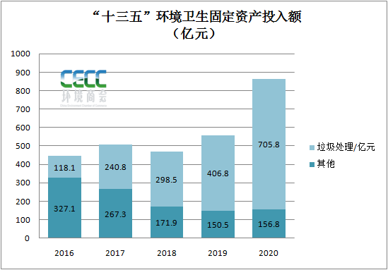“十三五”時期,城市市容環(huán)境衛(wèi)生累計(jì)固定資產(chǎn)投資總額2844億元,其中垃圾處理累計(jì)投資1770億元,較“十二五”整體增長145%。2020年,市容環(huán)境衛(wèi)生方面的固定資產(chǎn)投資額為862.648億元,占全年固定資產(chǎn)總投資的3.9%,其中垃圾處理設(shè)施建設(shè)投入資金逐年提升,從2016年118億左右增至2020年705.8億元,投資額占環(huán)境衛(wèi)生固定資產(chǎn)投資總額的比例較“十二五”提升42.2%。