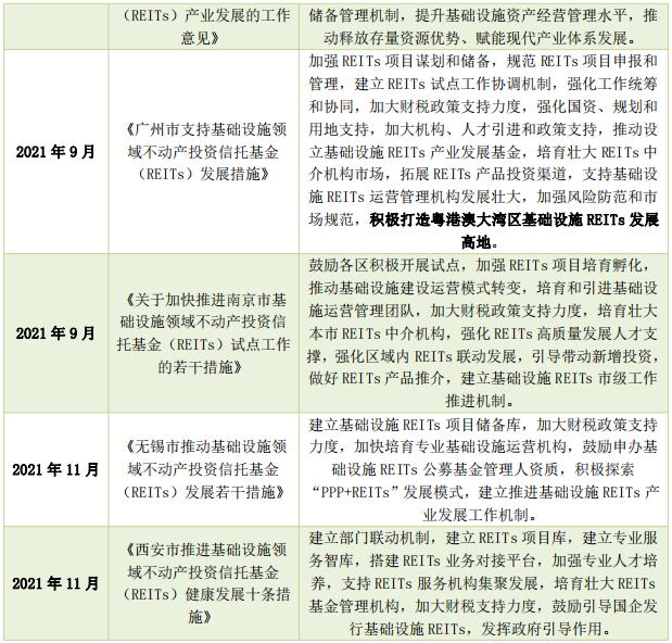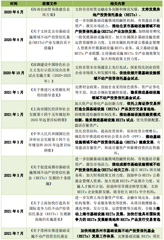 另外,中央、地方政府出臺(tái)的部分政策文件、省市區(qū)域的遠(yuǎn)景規(guī)劃也將REITs列為重要內(nèi)容之一,推動(dòng)REITs在重點(diǎn)省份、城市與行業(yè)的應(yīng)用和推廣。部分核心一、二線城市如北京、上海、成都、蘇州也相繼推出促進(jìn)本市及所在區(qū)域的基礎(chǔ)設(shè)施REITs發(fā)展的政策或?qū)嵤┐胧?,?gòu)建本市基礎(chǔ)設(shè)施REITs發(fā)展工作體系,推動(dòng)地方基礎(chǔ)設(shè)施REITs健康持續(xù)發(fā)展。