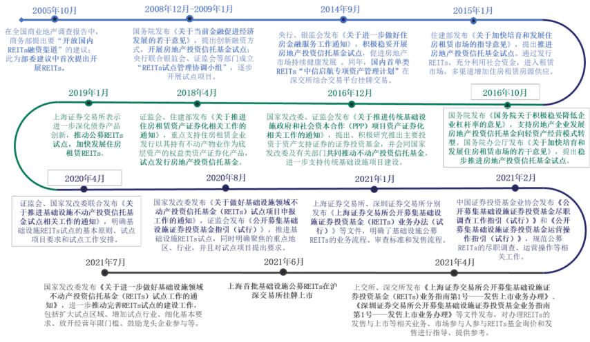 2016年3月,《國務(wù)院批轉(zhuǎn)國家發(fā)展改革委關(guān)于2016年深化經(jīng)濟(jì)體制改革重點(diǎn)工作意見的通知》提出,支持開展基礎(chǔ)設(shè)施資產(chǎn)證券化試點(diǎn),研究制定房地產(chǎn)投資信托基金規(guī)則,積極推進(jìn)試點(diǎn)。同年12月,國家發(fā)改委、證監(jiān)會(huì)發(fā)布《關(guān)于推進(jìn)傳統(tǒng)基礎(chǔ)設(shè)施政府和社會(huì)資本合作(PPP)項(xiàng)目資產(chǎn)證券化相關(guān)工作的通知》,推動(dòng)不動(dòng)產(chǎn)投資信托基金,充分依托資本實(shí)施積極推進(jìn)符合條件的PPP項(xiàng)目通過資產(chǎn)證券化的方式實(shí)現(xiàn)市場化融資,從而進(jìn)一步支持傳統(tǒng)基礎(chǔ)設(shè)施項(xiàng)目建設(shè)。2017年6月,財(cái)政部、中國人民銀行、證監(jiān)會(huì)聯(lián)合發(fā)布《關(guān)于規(guī)范開展政府和社會(huì)資本合作項(xiàng)目資產(chǎn)證券化有關(guān)事宜的通知》,推動(dòng)不動(dòng)產(chǎn)投資信托基金發(fā)展,鼓勵(lì)各類市場資金投資PPP項(xiàng)目資產(chǎn)證券化產(chǎn)品。2019年1月,上海證券交易所表示進(jìn)一步深化債券產(chǎn)品創(chuàng)新,推動(dòng)公募REITs試點(diǎn),公募REITs試點(diǎn)階段正式開啟。