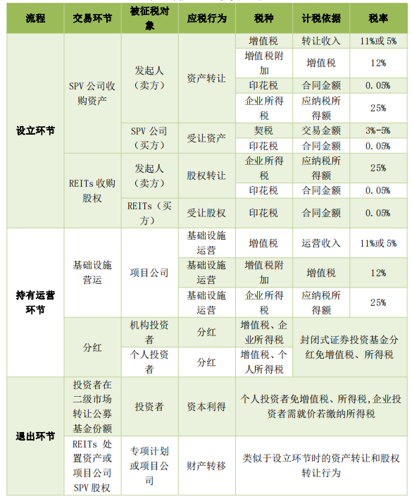 REITs的運(yùn)作主要包括三個(gè)環(huán)節(jié):即設(shè)立(資產(chǎn)重組、股權(quán)轉(zhuǎn)讓)環(huán)節(jié)、持有運(yùn)營環(huán)節(jié)和退出環(huán)節(jié),涉及的稅種包括:印花稅、企業(yè)所得稅、契稅、增值稅等。其中,基礎(chǔ)設(shè)施REITs面臨的稅收問題主要是資產(chǎn)重組環(huán)節(jié)涉及的土地增值稅和股權(quán)轉(zhuǎn)讓環(huán)節(jié)涉及的企業(yè)所得稅。設(shè)立REITs通常需對基礎(chǔ)設(shè)施資產(chǎn)進(jìn)行資產(chǎn)重組,并被視為交易行為,需繳納相關(guān)稅費(fèi)。如果涉及土地轉(zhuǎn)讓的,原則上則應(yīng)當(dāng)征收土地增值稅。而在部分國家,對于REITs底層資產(chǎn)的契稅、印花稅等稅種有減免,在我國針對REITs底層資產(chǎn)的稅收減免缺失。