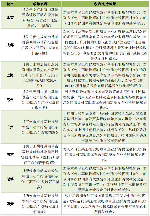 值得關(guān)注的是,在北京、上海、成都等城市發(fā)布的REITs推動(dòng)政策或?qū)嵤┐胧┮呀?jīng)開始關(guān)注REITs稅收問題,并出臺(tái)了針對性地稅收支持政策助力REITs發(fā)行與持有。包括對基礎(chǔ)設(shè)施REITs項(xiàng)目相關(guān)稅收問題開辟稅務(wù)咨詢綠色通道;在資產(chǎn)重組環(huán)節(jié)產(chǎn)生稅費(fèi)予以優(yōu)惠;在運(yùn)營期對項(xiàng)目公司及管理機(jī)構(gòu)經(jīng)營所得予以所得稅優(yōu)惠;在分紅環(huán)節(jié)對于投資者分紅予以所得稅優(yōu)惠等。