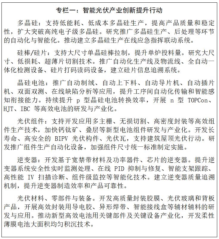 加快產(chǎn)業(yè)技術(shù)創(chuàng)新。推進(jìn)智能光伏產(chǎn)業(yè)鏈技術(shù)創(chuàng)新,加快大尺寸硅片、高效太陽能電池及組件等研制和突破。夯實配套產(chǎn)業(yè)基礎(chǔ),推動智能光伏關(guān)鍵原輔料、設(shè)備、零部件等技術(shù)升級。開展智能光伏與建筑節(jié)能、交通運輸、綠色農(nóng)業(yè)等領(lǐng)域相結(jié)合的交叉技術(shù)研究。