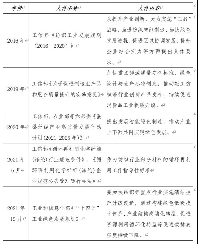 國家政策層面,自2016年起工信部聯(lián)合各部委陸續(xù)發(fā)布多個工業(yè)、制造業(yè)高質量發(fā)展實施意見,其中多次提到紡織行業(yè)作為重要領域,要加快綠色制造、綠色設計,推動行業(yè)循環(huán)再利用,促進行業(yè)高質量綠色發(fā)展。