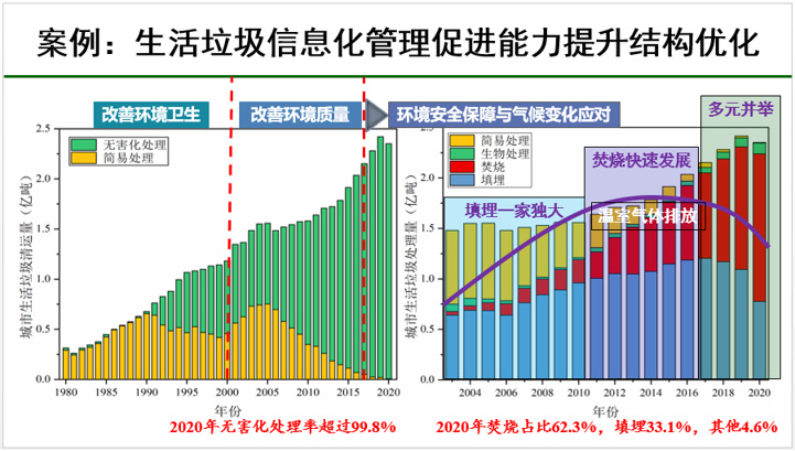 產(chǎn)生多少固廢都不清楚的情況下怎么計算減碳?劉建國表示,固廢治理首先需要借助新一代信息化技術把底數(shù)摸清楚。城市生活垃圾板塊就做了很好的示范,數(shù)據(jù)從過去的粗放狀態(tài)到近年越來越逼近真實,數(shù)據(jù)呈現(xiàn)也越來越清晰。2020年城市生活垃圾無害化處理率超過99.8%,其中焚燒占比62.3%,填埋33.1%,其他4.6%,城市生活垃圾處理方式從填埋一家獨大到焚燒快速發(fā)展再到現(xiàn)在多元并舉,管理水平的提升帶來了垃圾處理方式的進步,從最初環(huán)境衛(wèi)生問題的解決到環(huán)境質量問題的解決,再到現(xiàn)在環(huán)境安全問題和氣侯變化的應對,其中精細化管理和信息化管理發(fā)揮了很重要的作用。