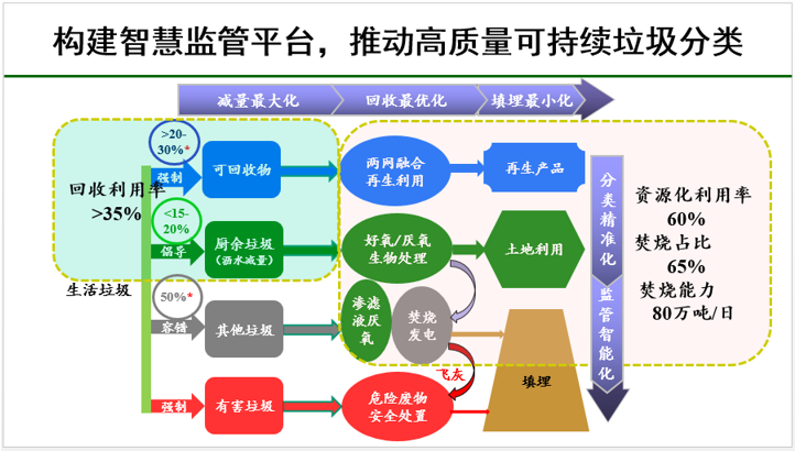 三是,構建智慧監(jiān)管平臺,推動高質量可持續(xù)垃圾分類。垃圾分類靠過去粗放管理方式不可能實現(xiàn)全覆蓋,必須要借助于信息化手段。要達成“十四五”規(guī)劃中提到的生活垃圾資源化利用率60%的目標,生活垃圾就要做到減量最大化、回收最優(yōu)化、填埋最小化,而這些依賴于分類精準化,說到底要靠監(jiān)管智能化來實現(xiàn)。