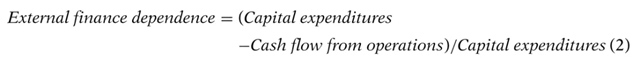 為了衡量企業(yè)能夠在多大程度上自行籌集資金,作者按照Whited(2006)和Duchin, Ozbas和Sensoy(2010)的方法構建了如下指標,如式(3)所定義。作者進一步將企業(yè)劃分為現金流流動性強弱劃分:如果企業(yè)的指數高于中位數,則被劃分為高流動性,否則被劃分為低流動性。