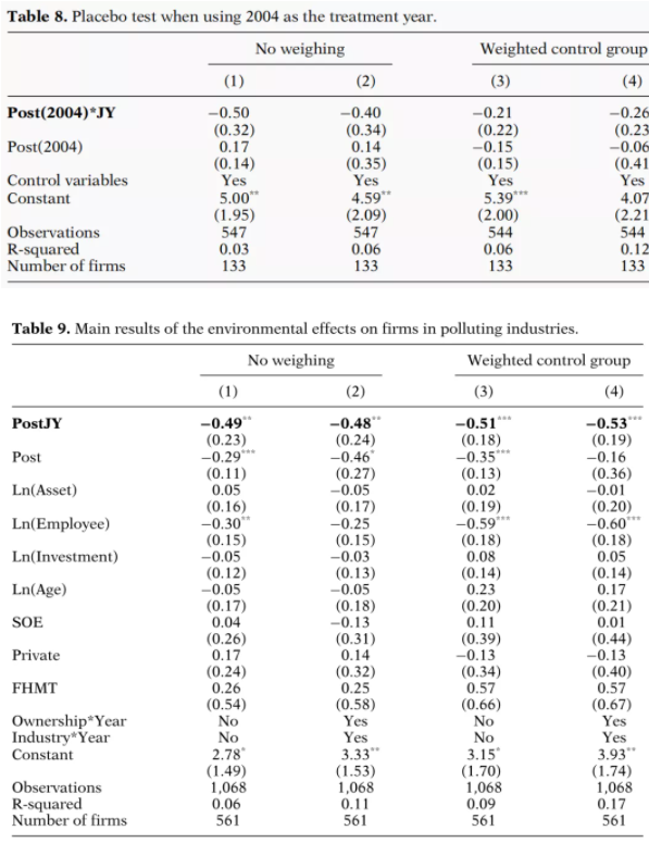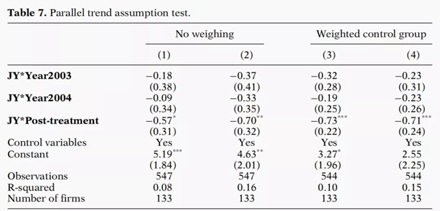 文章中的表3顯示了構建合成江陰市的其他城市的貢獻權重。很明顯,常熟和吳江提供了最有用的信息,而邳州、宜興和東臺也做出了一定的貢獻。因此,在公司層面的分析中,作者將這五個城市中的公司作為DiD分析的對照組。
